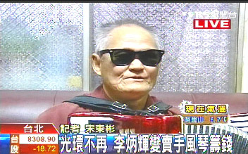 而以一首“流浪到淡水”走红的盲人歌手李炳辉,去年刚满60岁,几年前中风后无法演出,昨天在妻子搀扶下上节目,说要把视为第二生命的一把手风琴拍卖掉,度过年关,他也希望各界能给机会让他演出,换顿饭吃。