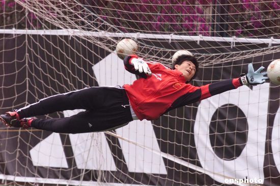 资料图:前国家队门将区楚良飞身扑救险球。 中新社发 毛建军 摄