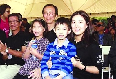 为了配合活动的需要,伏明霞与老公一同穿上了印有活动标记的T恤衫,显得精神干练,而儿女的着装则要休闲一些,看起来一家四口其乐融融,既是为活动添彩,也是同享天伦之乐。