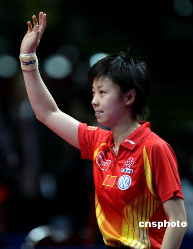 2006年5月1日凌晨(北京时间),第48届世乒赛女子团体赛决赛的对抗在德国不莱梅展开,中国队以3比1战胜中国香港队,成功卫冕考比伦杯,实现了七连冠。图为独得两分的张怡宁向观众挥手致意。