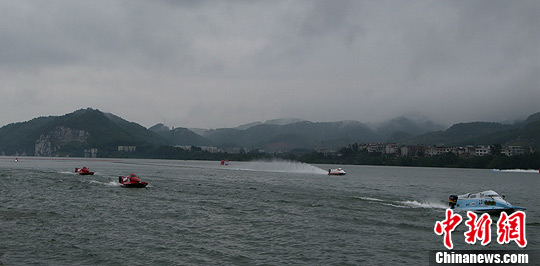 由于受台风影响,广西柳州市当日阴雨不定,下午15时,比赛在细雨纷飞的柳江河面展开。随着巨大的发动机轰鸣声,18艘参赛艇尾部喷射着十多米长的水花,展开激烈的排位争夺。