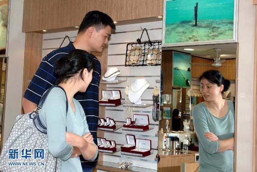 10月1日,姚明和夫人叶莉在布鲁姆郊区的一家珍珠商店参观购物。新华社记者江亚平摄