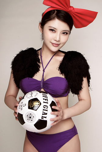 徐冬冬一身暗紫色性感比基尼、肩膀披上黑色的毛领、红色蝴蝶结发卡装扮上镜,萌翻现场所有工作人员,摄影师大赞徐冬冬极具可塑性和创意十足的想法,这一次的足球宝贝写真又将是一次大突破。
