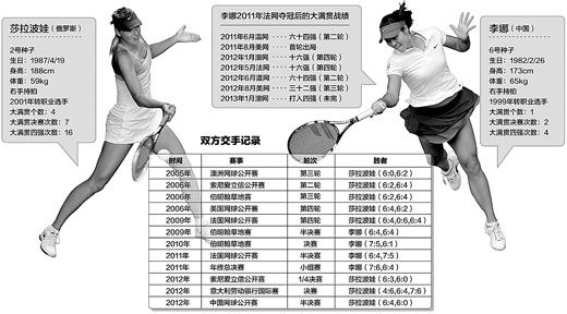 李娜与莎拉波娃交手12次,以4胜8负处于劣势。双方最近一次交手是去年中网的半决赛,李娜被莎拉波娃以2∶0横扫。谈到去年3次负于对手的经历,李娜淡定地说:“去年已经过去了。”