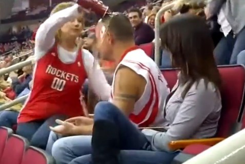 女神将饮料洒在男球迷头上。图片来源:视频截图