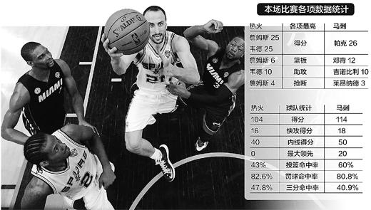 马刺队的高命中率反映出热火队防守顾此失彼、漏洞百出。比赛中热火队曾一度将比分追至只差1分,但马刺队的外线神射手丹尼·格林让热火队的努力化为泡影。本场比赛,格林投进6个三分球,他也以25个三分球创造了总决赛三分球命中新纪录,更让人吃惊的是他的命中率,总决赛前五场他38投25中,命中率高达65.8%。