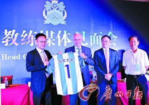 左起:富力俱乐部总经理章彬、埃里克森、富力俱乐部副董事长陆毅、广州足协秘书长谢志光一同现身媒体见面会。 本报记者 廖艺 摄