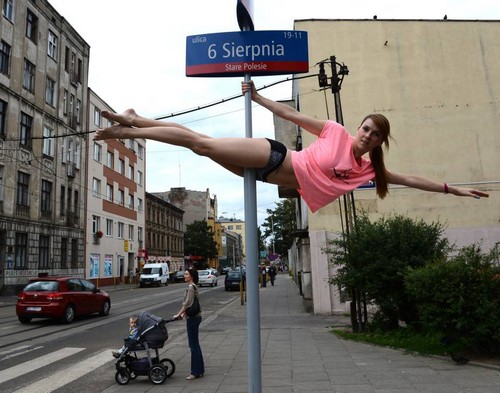 波兰花游运动员街头练习钢管舞 惹路人驻足(图)(8)
