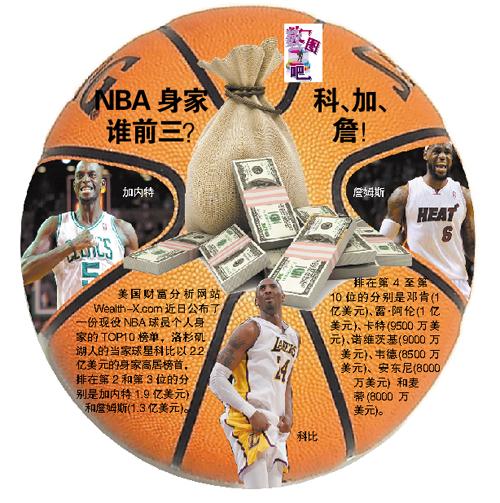 美国财富分析网站近日公布了一份现役NBA球员个人身家的TOP10榜单,洛杉矶湖人的当家球星科比以2.2亿美元的身家高居榜首,排在第2和第3位的分别是加内特1.9亿美元)和詹姆斯(1.3亿美元)。