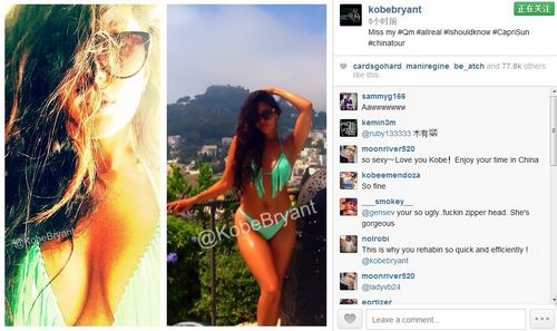 除此之外,科比似乎有些想家了,更是想念“家中的她”了。科比在网上发了两张瓦妮莎的性感比基尼照,其中一张更是上半身的特写。照片中,瓦妮莎散着头发,大方秀着事业线。科比给这两张照片的配文是,“想我的(她)了,真的!”
