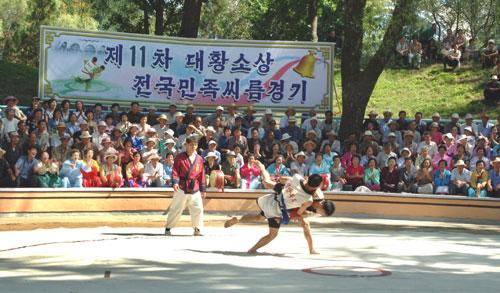 朝鲜第11届大黄牛奖全国民族摔跤大赛开幕(图)