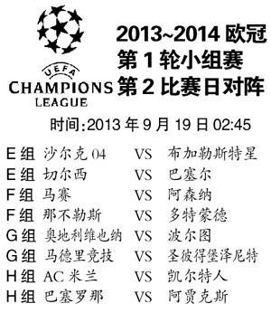 本报讯 (记者 周婉琪) 北京时间明天凌晨,2013~2014欧冠将展开小组赛首轮第2比赛日的8场争夺,此夜过后,新赛季欧冠32强就将全部亮相完毕,“死亡之组”F组也将在明天开打。