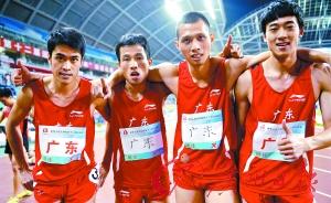 广东队的男子4×400米接力冠军成员崔濠镜、覃健、刘孝生和区绍伟(从左至右)。新华社记者 韩瑜庆 摄