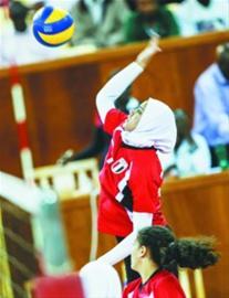 9月17日,在肯尼亚首都内罗毕进行的非洲国家冠军杯女排赛中,突尼斯队以3∶0战胜埃及队。这是埃及队球员穆斯塔法在比赛中扣球。