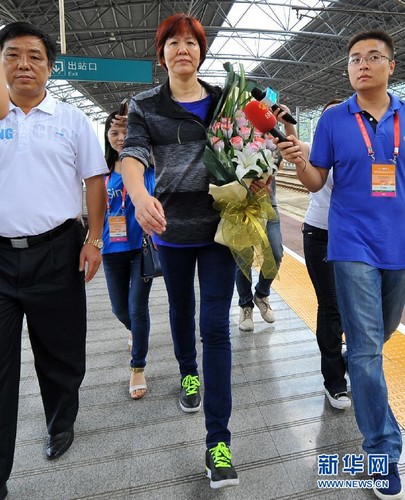 参与互动(0)中国女排主教练郎平(中)抵达湖南郴州。新华社发(李细万 摄)