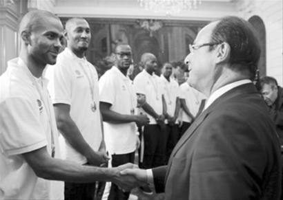9月24日,法国总统奥朗德在爱丽舍宫接见新科男篮欧锦赛冠军法国队球员。 9月22日,法国队击败立陶宛队,历史上首次夺得男篮欧锦赛冠军。奥朗德(右)与帕克握手致意。