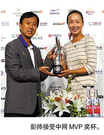 据了解,自8月26日昆仑山中网MVP评选启动,就引起众多球迷朋友和媒体的关注,在网络、短信、微博、中网现场等各竞猜评选渠道,数十万名球迷、媒体记者等投出了自己宝贵的一票。对于再次获得昆仑山中网MVP,彭帅感言:“首先要感谢昆仑山雪山矿泉水对中国网球运动员的支持和鼓励,中网MVP不仅是一份荣耀,更是对中国网球运动员的巨大肯定。在今年的中网比赛中,李娜、郑洁、张帅等中国球员也都有精彩的表现,也希望有更多中国球员在国际网球赛事上取得更加突出的成绩。”