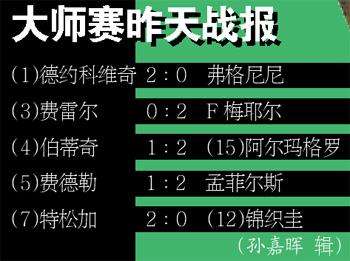 而赛会3号种子费雷尔同样状态低迷,以4比6和3比6不敌F·梅耶尔,止步16强。不过,输掉比赛的两人都没闲着,费德勒和中国小将张择联袂出战男双第二轮,结果他们以1比6、6比1和8比10不敌赛会5号种子多迪格/梅洛,止步16强。而费雷尔则没有受到输球坏心情的影响,如约出席奥佳华大师椅球迷见面会,互动、做游戏,完全没有伤感情绪。