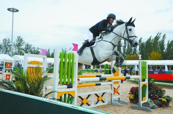 国际马联场地障碍世界杯在朝阳公园继续进行,赛事高潮迭起,中国选手表现可圈可点,引人关注。图为天星调良国际马术俱乐部的杨富军在比赛中。 组委会供图