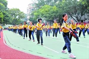 广州市天河区柯木塱小学近日举行了一堂别开生面的体育公开课——“击球投篮”、“拦截导弹”等,一系列羽毛球游戏生动有趣,伴随着欢声笑语,最有意思的是,在欢快的音乐旋律节奏下,学生们挥舞着一个个红色的水瓶,模拟各种羽毛球技术动作,跳起了羽球健身操。