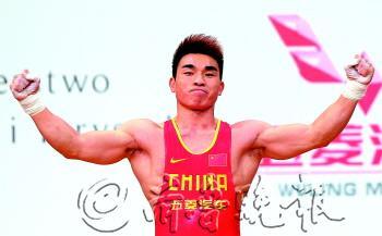 10月23日,在2013年世界举重锦标赛中,中国选手廖辉分别以198公斤和358公斤的成绩打破男子69公斤级挺举和总成绩世界纪录,并包揽该级别抓举、挺举和总成绩三枚金牌。图为廖辉在抓举比赛中试举成功后庆祝。