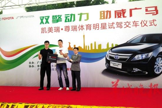羊城晚报讯 记者李斯睿报道: 昨日,由广汽丰田汽车有限公司主办、广东羊城晚报文化传播有限公司联合协办的“双擎动力 助威广马”混合动力凯美瑞·尊瑞体育明星试驾交车仪式在广州中华广场举行,CBA冠军球星朱芳雨、王仕鹏(上图)等出席仪式,为即将开跑的2013年广汽丰田广州马拉松赛助威。