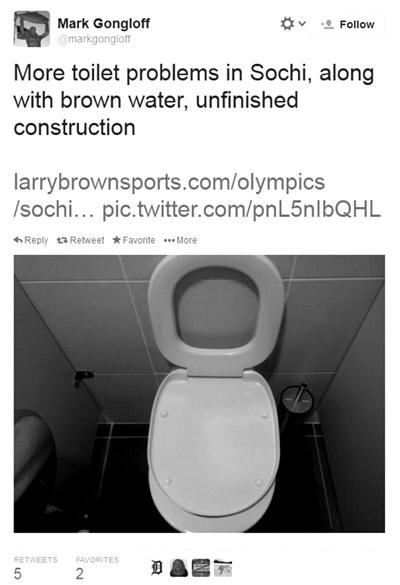 时间倒回各国记者提前入住索契之时,社交媒体呈现的索契冬奥会,“主战场”在宾馆“奇葩”卫生间——只有一半的马桶、毫无隐私的并排马桶、不能在马桶里垂钓的图示这些都忍了,马桶正对面摆三把椅子是要闹哪样?当然,还有凌乱不堪的客房、黄色自来水、早餐蜂蜜中趴着的蜜蜂、吊在墙上的路由器……