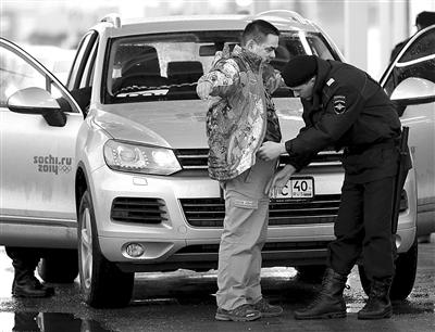 超严安保 1月23日,索契奥运会公园入口,一名警察在对过往车辆进行安检。