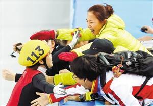 中国队短道速滑主教练李琰(上)庆祝周洋(左)夺冠。(新华社资料照片)