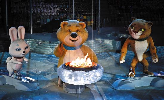 ▲索契冬奥会吉祥物小熊(中)在闭幕式上吹熄圣火 新华社照片