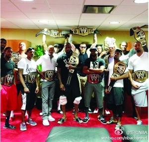 昨天,热火球星、“小皇帝”詹姆斯在训练结束后,送给每位队友一条WWE(美国职业摔角)冠军金腰带。收到这份特别的礼物后,小伙伴们欣喜不已,大家戴着冠军金腰带在更衣室里拍了张大合照。画面中,“鸟人”安德森兴奋地将金腰带高高举起。而查莫斯迫不及待地在网络上炫耀说:“冠军金腰带太帅了,从小我就希望能得到它。”