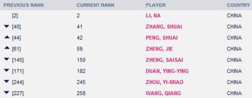 中国金花方面,张帅下降1位,排名第41;彭帅上升2位,排名第42位;郑洁上升2位,排名第59位;郑赛赛下降5位,排名第150;段莹莹下降11位,排名第171;周弈妙下降1位,排名第245位;王蔷下降31位,排名第258。