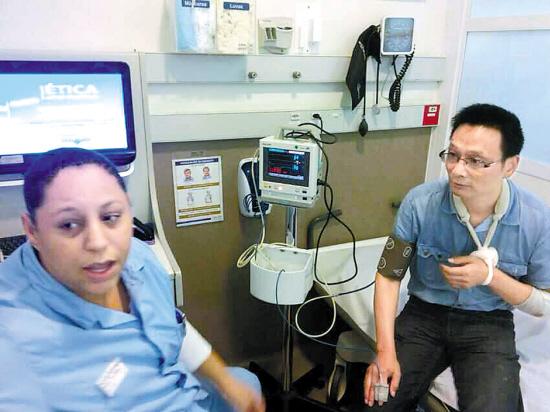 《江南晚报》特派记者路啸(右)在巴西医院接受治疗