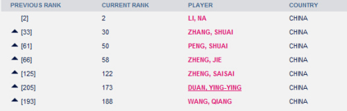 其他中国金花排名普遍提高,张帅从第33升至第30,排名首次进入前30,彭帅从第61升至第50,郑洁从第66升至第58,郑赛赛从第125名升至第122名,段莹莹从第205升至第173名,王蔷从第193名升至第188。