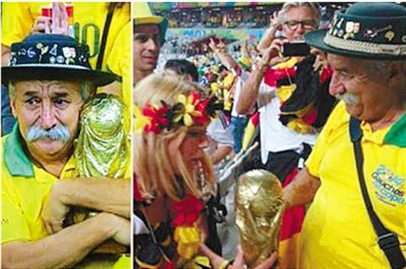 海都讯 巴西队惨败让不少巴西球迷非常难过。可是一位巴西老爷爷球迷却将大力神杯模型送德国球迷引发网友关注。