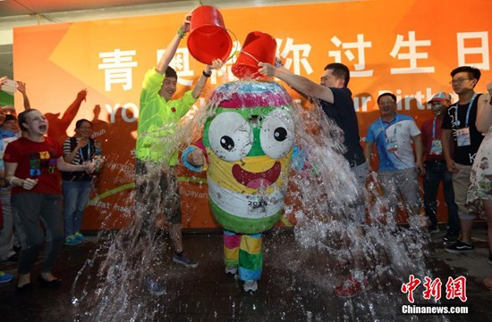 2天后,南京青奥会主媒体中心二楼广场举办活动为媒体记者过生日活动上,青奥会吉祥物砳砳也在工作人员的协助下挑战“冰桶”。