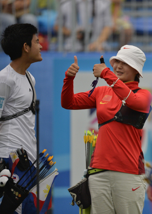 其实,这样的组合并不让人意外。射箭混合国际团体赛规定,男子排名赛第1与女子排名赛第32配对、男子第2与女子第31配对,依次类推。女子排名赛第3名、北京姑娘李佳蔓与男子第30名、菲律宾小将路易斯-莫雷诺搭档赛,结果他们拿走了冠军。李佳蔓看来,语言问题不会构成障碍,“射箭就是我们最好的沟通方式,很高兴结识这位小伙伴。”