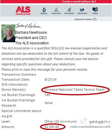 国乒冰桶挑战捐款2300美元。图片来源:《乒乓世界》杂志官方微博