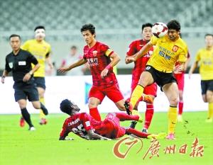 埃尔克森(黄衣)赛后还为错失几次进球机会而懊悔不已。 特派记者 廖艺 摄