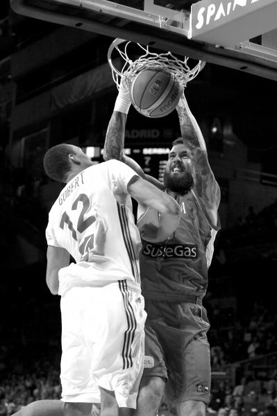 塞尔维亚队球员拉杜利察(右)在法国队球员戈贝尔的防守下灌篮。新华社发