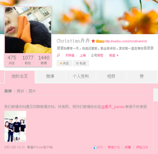昨天傍晚,网友“@Christian卉卉”发布新浪微博,写道,“我们新婚夫妇遇见刘翔新婚夫妇,好亲民,祝你们新婚快乐拉@葛天_panda 新娘子好美丽。”