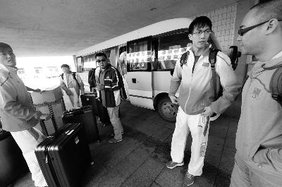 距离规定的发车时间还有半小时,田径队的队员就开始带着自己的行李走出总局南公寓,心情不错的李金哲还和前来送行的队友和教练有说有笑。在安放好行李后,跳高名将王宇也一脸轻松地快步走向大巴,面对记者的镜头,他露出了标志性的微笑,在登上大巴后还和队友攀谈起来。