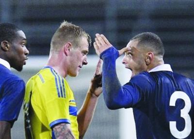 法国队进球后,法国球员库尔扎瓦(蓝衣)冲瑞典前锋圭德蒂做了个“拜拜”的手势,一分钟后,瑞典颁平比分,圭德蒂向库尔扎瓦回礼。