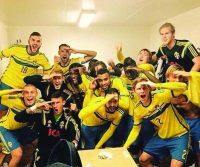 赛后,瑞典队员在更衣室集体做出手势讽刺法国队。