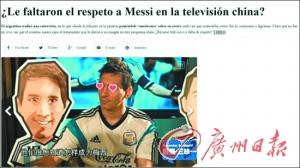阿根廷“INFOBAE”网站近日表示,梅西接受了中国一家电视台的专访,这家电视台通过编辑的方式,在梅西每次回答问题时,都在其脸上加上一些动画表情,比如雨水、花心或者眼泪。这显然不是现场制作的,这也意味着梅西并不知道这个节目对自己的形象做了什么样的“篡改”。他们随即质疑道:这种电视技术手段是不是对梅西欠缺尊重的表现?西班牙《每日体育报》也报道说,中国一家电视台以非常怪异的方式处理对梅西的专访,巴萨球迷对这样的采访不会感兴趣。