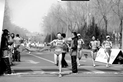 吕秀芝冲过终点。京华时报记者潘之望摄