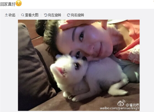 中新网5月25日电 昨天下午,潘晓婷在微博中晒出了两张家居照,并感慨道:“回家真好”。照片中,她抱着一只可爱的小狗,嘟起嘴卖萌。网友看后赞潘晓婷像邻家姐姐,也有网友看后调侃道:“放开那只狗,让我来”。