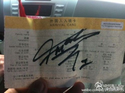麦蒂在入境卡上签名 图片来源:网友微博