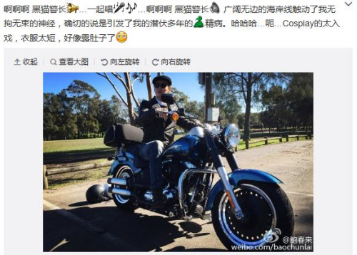 上一页 鲍春来晒摩托车骑行照 自比“黑猫警长”(图)(4)