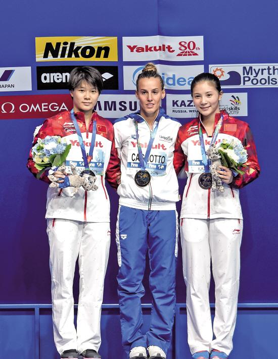 羊城晚报今晨消息 记者苏荇报道:何姿和施廷懋的双保险,仍未能为中国队保住女子1米板金牌——今晨在2015年喀山游泳世锦赛,世锦赛八朝元老、意大利的卡格诺托以310.85分问鼎,施廷懋以1.65分之差屈居亚军,卫冕冠军何姿仅获第三名。